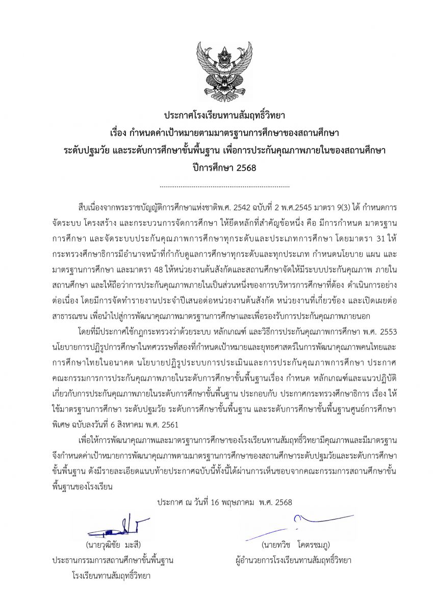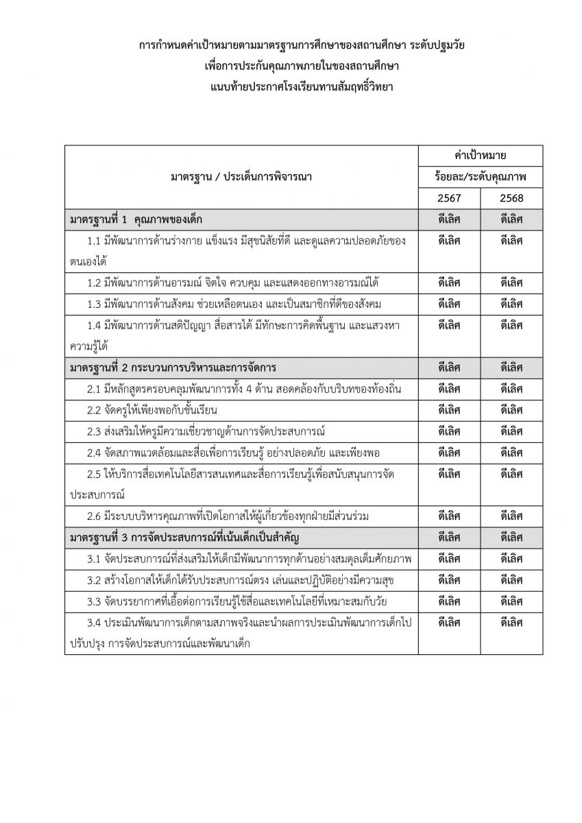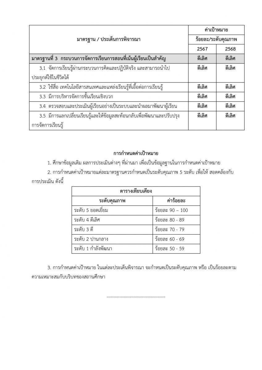 กำหนดค่าเป้าหมายตามมาตรฐานการศึกษาของสถานศึกษา ระดับปฐมวัย และระดับการศึกษาขั้นพื้นฐาน เพื่อการประกันคุณภาพภายในของสถานศึกษา ปีการศึกษา 2568