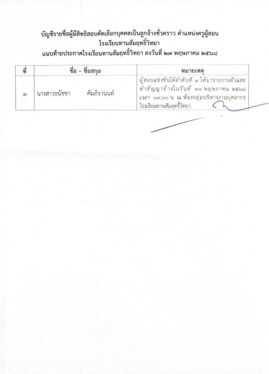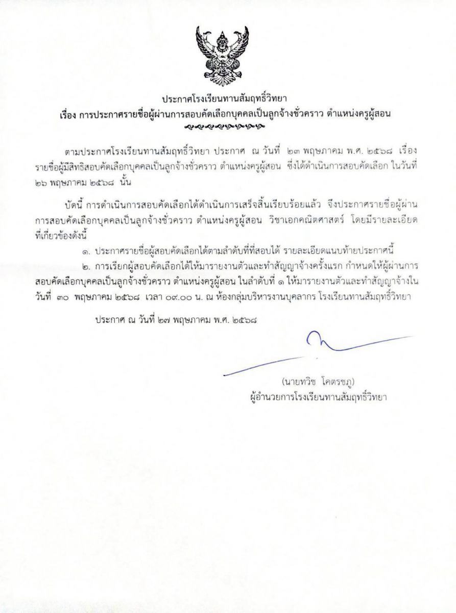 ประกาศรายชื่อผู้ผ่านการสอบคัดเลือกบุคคลเป็นลูกจ้างชั่วคราว ตำแหน่งครูผู้สอน