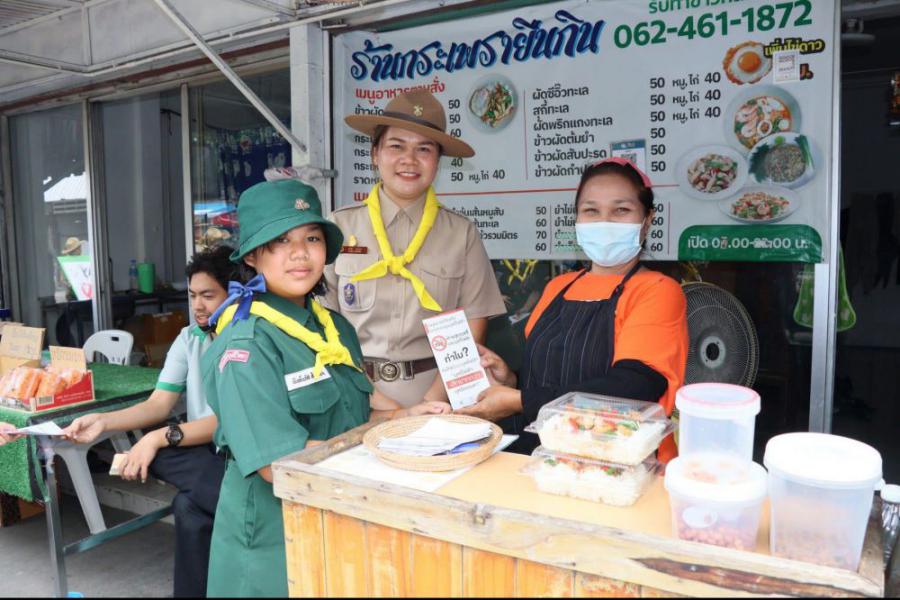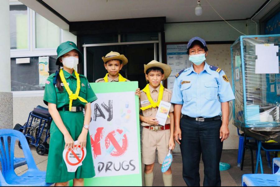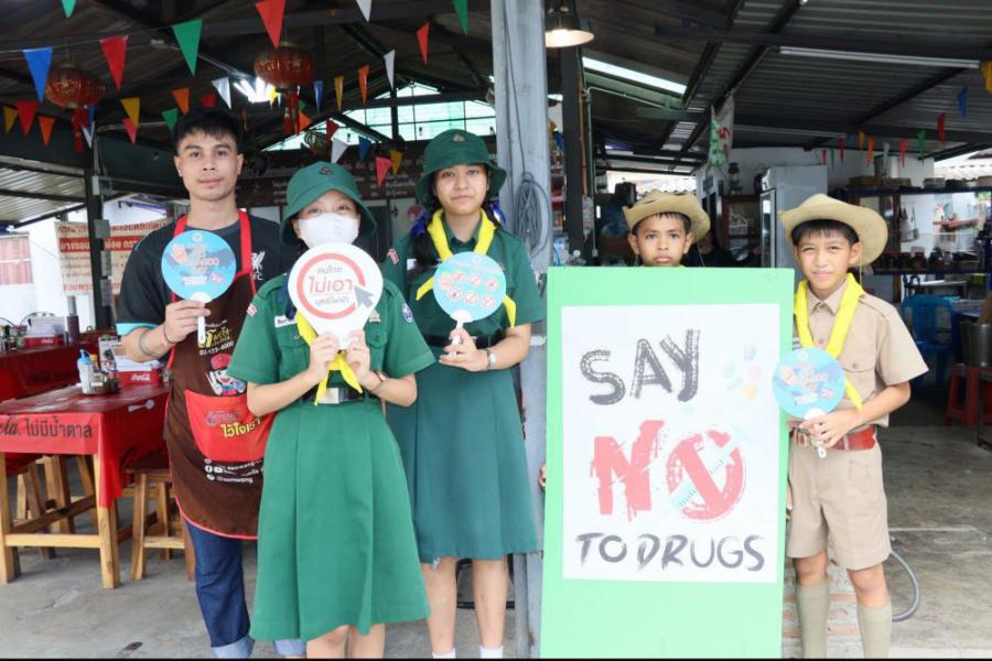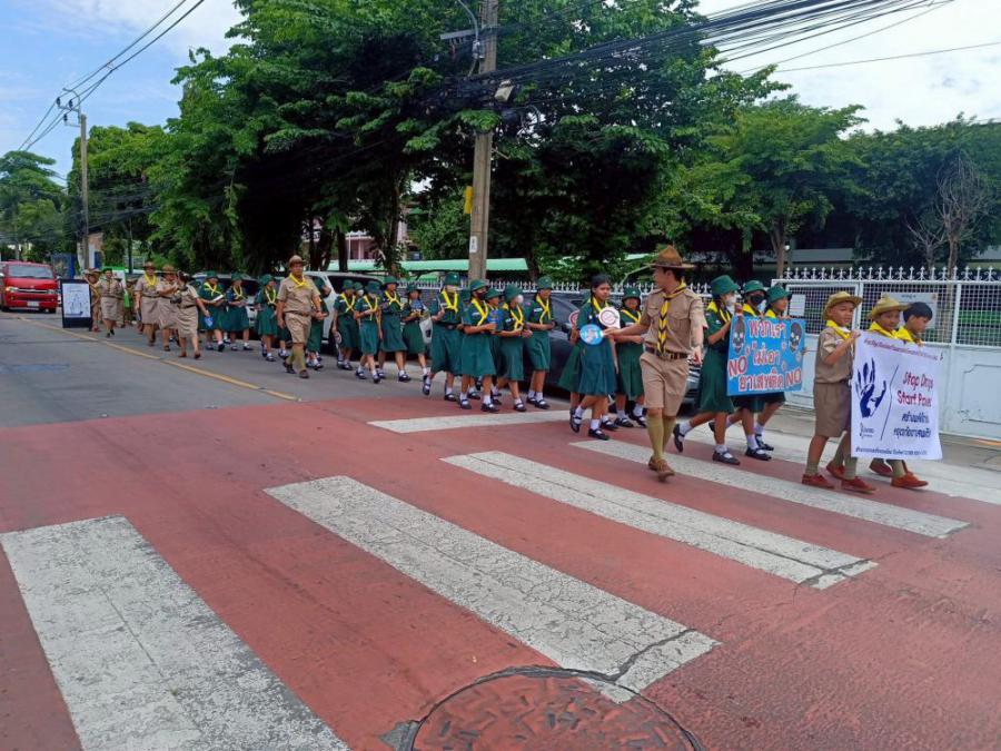 หน่วยลูกเสือจิตอาสาพระราชทาน หน่วยที่ 2 และ 3 เดินรณรงค์และแจกแผ่นพับให้ความรู้เกี่ยวกับโทษภัยและการป้องกันยาเสพติด