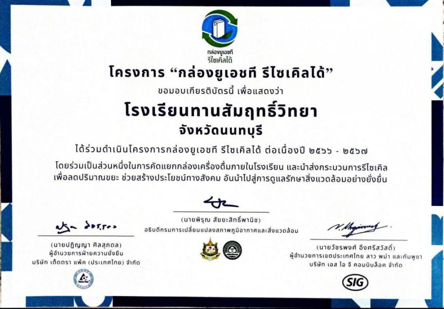 โรงเรียนทานสัมฤทธิ์วิทยา ได้รับเกียรติบัตรเข้าร่วมโครงการ กล่องยูเอสที รีไซเคิลได้ ต่อเนื่องปี 2566-2567 โดย กรมการเปลี่ยนแปลงสภาพอากาศและสิ่งแวดล้อม กระทรวงทรัพยากรธรรมชาติและสิ่งแวดล้อม และ SIG S:0